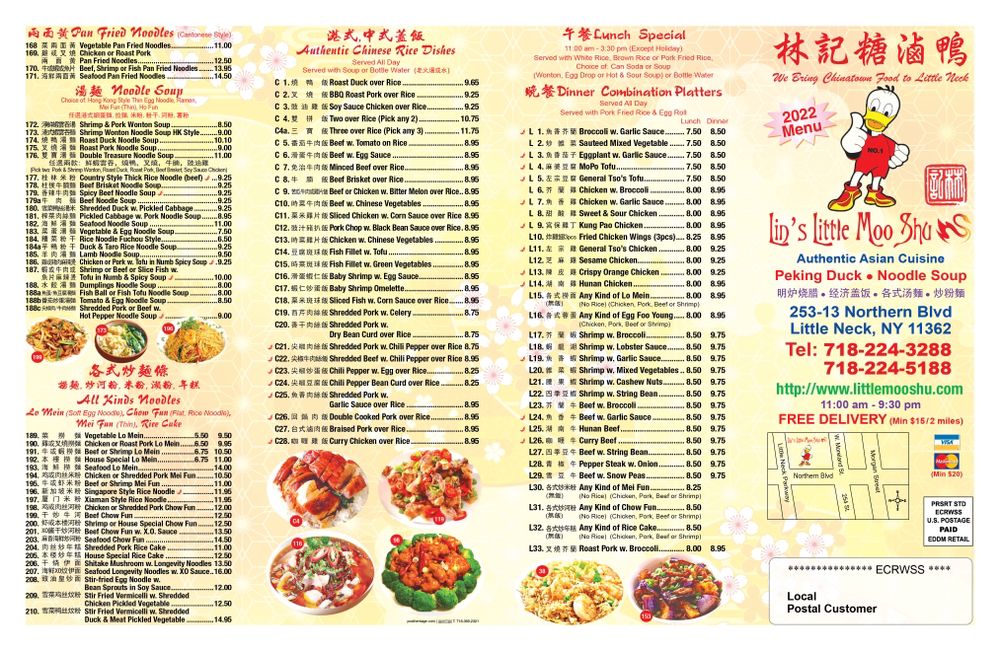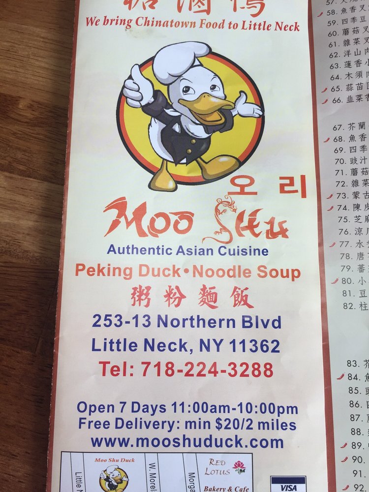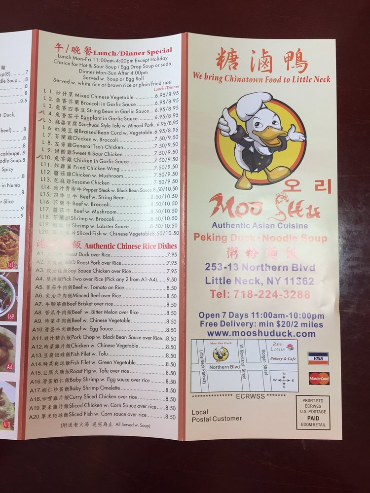 Introducing Moo Shu Duck, a hidden gem in Little Neck, NY, offering authentic Chinese cuisine with a focus on Cantonese roast meats. This Asian-owned restaurant provides a variety of options like Peking duck, roast pork, and soy sauce chicken. Customers rave about the flavorful duck and rice combo, along with the reasonable prices and quick takeout service. The menu boasts lunch specials like Mixed Chinese Vegetables and Broccoli in Garlic Sauce, as well as a variety of fried rice and noodle dishes. With a cozy atmosphere and friendly staff, Moo Shu Duck is the go-to spot for delicious Chinese takeout. The restaurant also offers vegan and vegetarian options, making it suitable for a wide range of dietary preferences. Don't miss out on this authentic Chinese dining experience in the heart of Little Neck.